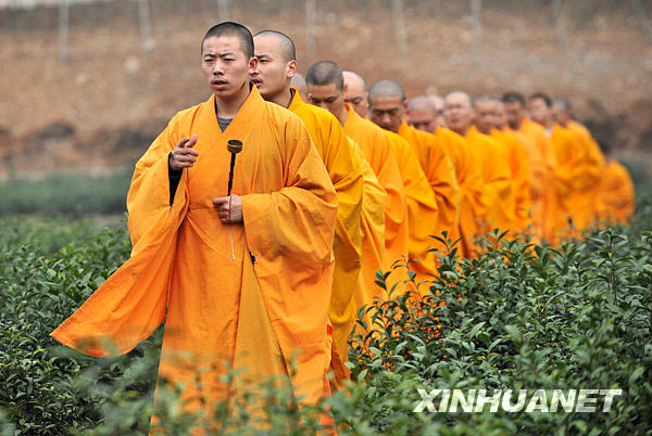3月19日,杭州法凈寺的僧人在“灑凈儀式”上。當日,杭州古剎法凈寺的僧人開始在寺院的龍井茶地里采摘“法凈禪茶”!胺▋舳U茶”出于“西湖龍井茶”一系,是杭州法凈寺的僧人自種、自采、自炒和自用的有機綠茶。禪茶是佛家“以茶悟道”的一種特有茶文化,來源于“茶禪一味、茶僧一緣、茶寺一體”之說。