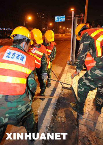 3月20日晚,工人在北京市西長安街南側(cè)施工。當晚,北京長安街開始大修,預(yù)計8月30日之前完工,大修期間,長安街白天仍可正常通行。記者從北京市交通委了解到,大修施工時間是每天23時至次日5時,將歷時5個月。伴隨此次道路大修,將同步進行交通工程、綠化整治和公交優(yōu)化,對建國門立交橋進行橋面翻新和結(jié)構(gòu)加固,對沿線多處地下通道出入口進行延長調(diào)整,實現(xiàn)長安街復(fù)興門至建國門路段五上五下雙向十車道的規(guī)劃,還將對察院胡同到國家大劇院段的南側(cè)主路進行展寬。 | |