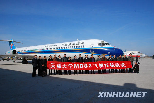 3月22日,天津大學(xué)斥資千萬元購買的中國南方航空公司一架MD82型商業(yè)飛行適航客機(jī)交接儀式在中國民航大學(xué)停機(jī)坪舉行。