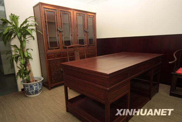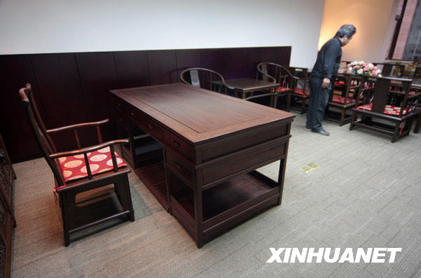 3月23日拍攝的展出的“羅格奧運(yùn)辦公家具”。據(jù)悉,國際奧委會(huì)主席羅格在北京奧運(yùn)會(huì)期間使用過的20件仿古風(fēng)格辦公家具將于3月底在北京拍賣。這套辦公家具以竹子為主料,包括書桌、官帽椅、書柜、會(huì)議桌椅、花幾、電視柜、圈椅等。