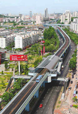 沿著輕捷的自動(dòng)扶梯,記者3月24日一早登上離地面9米的空中巴士站。BRT一號(hào)線起點(diǎn)站,與鼓浪嶼渡口相鄰,如上海外灘,客流稠密。8時(shí)30分,一輛長(zhǎng)12米的藍(lán)色BRT專用巴士穩(wěn)穩(wěn)入站,車門打開的瞬間,乘客隊(duì)伍前的感應(yīng)柵欄悄然打開,上方的電子顯示牌同時(shí)顯示出下兩趟車的發(fā)車時(shí)間。司機(jī)告訴記者,巴士由金龍客車量身定做,先進(jìn)的強(qiáng)制限速器,控制時(shí)速60公里,全程勻速行駛,平行?空九_(tái),誤差不超5厘米。車上5個(gè)攝像頭,車頭前有“黑匣子”,行車數(shù)據(jù)全記錄。 透過(guò)今天BRT新型、快速、現(xiàn)代、智能、美觀的“五高”目標(biāo),記者不由要去探尋它“低能耗、低污染、低投入、低占地和低出行費(fèi)用”的選擇背景! 緩解交通難,廈門最初的指向是建地鐵或輕軌,理由是作為海峽西岸中心城市,建設(shè)要有前瞻性。 然而,端著年財(cái)政收入220億元的盤子,市委、市政府反復(fù)算賬:每公里道路造價(jià),地鐵5億—6億元,輕軌1.5億—2億元,廈門地質(zhì)結(jié)構(gòu)復(fù)雜,建地鐵難度大、周期長(zhǎng)、投資成本高、客流量不足、運(yùn)營(yíng)成本過(guò)高!輕軌亦然。經(jīng)過(guò)反復(fù)調(diào)研,大運(yùn)量、快捷、準(zhǔn)時(shí)、舒適、安全、低能耗、低污染的BRT浮出水面。BRT建設(shè)運(yùn)營(yíng)成本僅為軌道交通的1/10;更重要的是,作為不足300萬(wàn)人口的城市,快速公交系統(tǒng)完全可以解決目前甚至今后相當(dāng)長(zhǎng)一段時(shí)期的群眾出行難題。 那么,可以讓百姓、政府、環(huán)境同時(shí)受惠的“五低”方案,能不能瞄準(zhǔn)“五高”目標(biāo),能不能贏得市民高滿意率呢?廈門在落實(shí)科學(xué)發(fā)展觀的過(guò)程中全力求解。經(jīng)過(guò)反復(fù)的學(xué)習(xí)、調(diào)研,爭(zhēng)論、碰撞,廈門市委、市政府最終形成了“一種選擇、兩項(xiàng)創(chuàng)新”的決策。 選擇興建快速公交系統(tǒng)!為解決公交車與社會(huì)車輛爭(zhēng)道矛盾,廈門創(chuàng)新模式,市區(qū)采用全路段高架模式,公交車享有全封閉專用路權(quán),無(wú)紅綠燈,確?焖佟(zhǔn)點(diǎn)、安全;為解決現(xiàn)在適用與將來(lái)發(fā)展的矛盾,BRT的道路和站臺(tái)設(shè)計(jì),采用升級(jí)輕軌的標(biāo)準(zhǔn),為未來(lái)改造預(yù)留空間,預(yù)算由此增加了2個(gè)億,廈門人說(shuō):值!