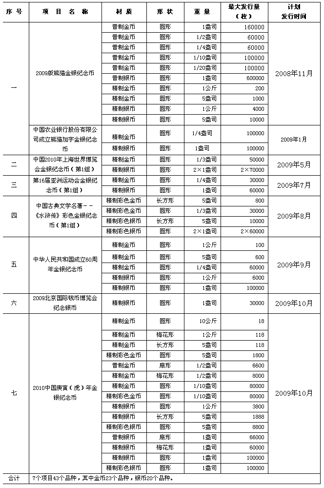 這7個項目分別為:2009版熊貓金銀紀(jì)念幣(其中包含中國農(nóng)業(yè)銀行股份有限公司成立熊貓加字金銀紀(jì)念幣)、中國2010年上海世界博覽會金銀紀(jì)念幣(第1組)、第16屆亞洲運(yùn)動會金銀紀(jì)念幣(第1組)、中國古典文學(xué)名著——《水滸傳》彩色金銀紀(jì)念幣(第1組)、中華人民共和國成立60周年金銀紀(jì)念幣、2009北京國際錢幣博覽會紀(jì)念銀幣、2010中國庚寅(虎)年金銀紀(jì)念幣。上述項目中,2009版熊貓金銀紀(jì)念幣已于2008年11月發(fā)行。