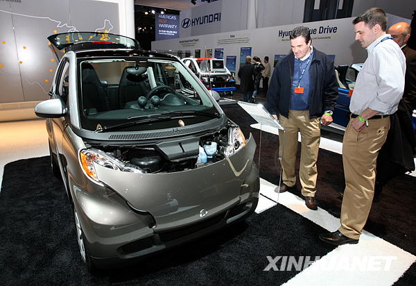 當(dāng)日,2009紐約國際車展對媒體開放,各大參展商主打節(jié)能環(huán)保牌,混合動力車、電動車等節(jié)能車型大行其道。本屆車展將于4月10日至19日對公眾正式開放。新華社記者劉欣攝