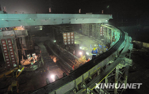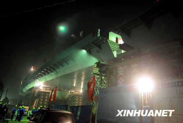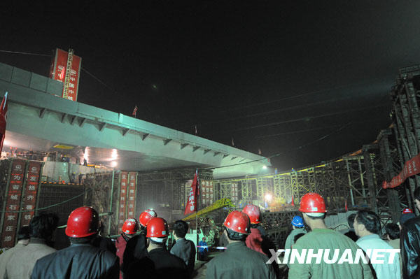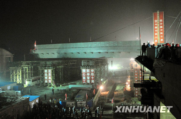 當(dāng)日凌晨1點(diǎn)55分,經(jīng)過一個(gè)多小時(shí)的緊張工作,由中國中鐵十局承建的石家莊和平路高架橋跨鐵路鋼箱梁成功旋轉(zhuǎn)86度角,與鐵路兩側(cè)的橋梁實(shí)現(xiàn)成功對(duì)接。