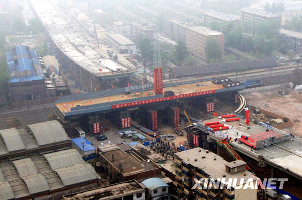 轉(zhuǎn)體前的石家莊和平路跨鐵路橋(4月14日攝)。