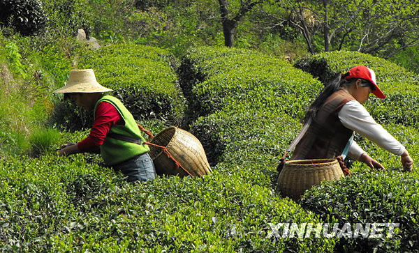 4月15日茶農(nóng)在馬頭山茶園采摘春茶。新華網(wǎng)發(fā)(張行拄 攝)