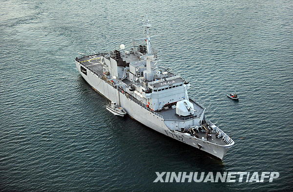 這是2008年11月25日在吉布提港附近海域拍攝的名為“Le Nivose”的法國軍艦。法國國防部2009年4月15日宣布,這艘法國軍艦當天在肯尼亞附近海域巡邏時抓獲了11名海盜。