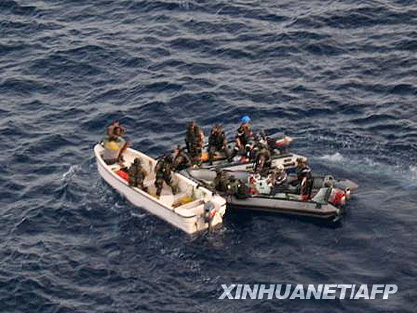 這張法國軍方公布的照片顯示,4月15日,法國士兵在肯尼亞附近海域抓獲海盜。
