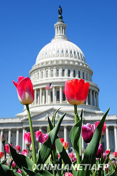 4月16日,郁金香在美國(guó)首都華盛頓國(guó)會(huì)山前綻放。