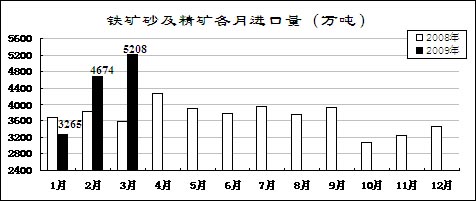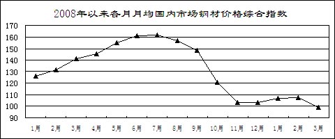 鋼材價格先升后降。受市場預(yù)期好轉(zhuǎn)和銷售企業(yè)補充庫存影響,鋼材價格從年初開始小幅回升,2月上旬國內(nèi)市場鋼材價格綜合指數(shù)為109.26,比去年12月最后一周回升5.96點。但由于有效需求沒有明顯恢復(fù)而生產(chǎn)增長較快,2月中旬開始鋼材價格持續(xù)大幅回落。3月最后一周,國內(nèi)市場鋼材價格綜合指數(shù)為97.16,比2月上旬回落12.1點,低于去年最低水平4.33點。3月份,6.5mm高線、20mm中厚板平均價格分別為3368元/噸和3443元/噸,比去年最低的11月份下降6.9%和2.3%,同比下降33.5%和42.3%;1.0mm冷軋板卷4312元/噸,比去年最低的11月份上漲4%,同比下降34.3%。