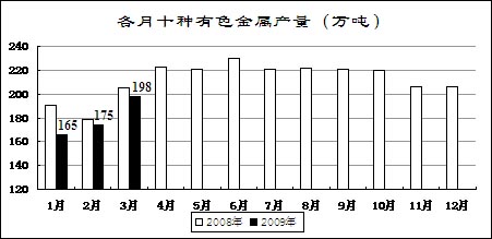 受國家收儲政策、企業(yè)大量停產(chǎn)減產(chǎn)等影響,主要有色金屬價格有所回升。3月份,國內(nèi)市場銅、電解鋁、鉛、鋅現(xiàn)貨平均價分別為32543元/噸、13261元/噸、12813元/噸和11735元/噸,比去年12月份回升21.3%、18.9%、22.5%和19.8%,同比下降51%、32.7%、40.9%和43.3%。