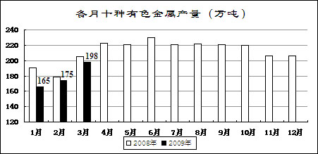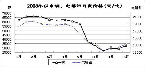 受國(guó)家收儲(chǔ)政策、企業(yè)大量停產(chǎn)減產(chǎn)等影響,主要有色金屬價(jià)格有所回升。3月份,國(guó)內(nèi)市場(chǎng)銅、電解鋁、鉛、鋅現(xiàn)貨平均價(jià)分別為32543元/噸、13261元/噸、12813元/噸和11735元/噸,比去年12月份回升21.3%、18.9%、22.5%和19.8%,同比下降51%、32.7%、40.9%和43.3%。