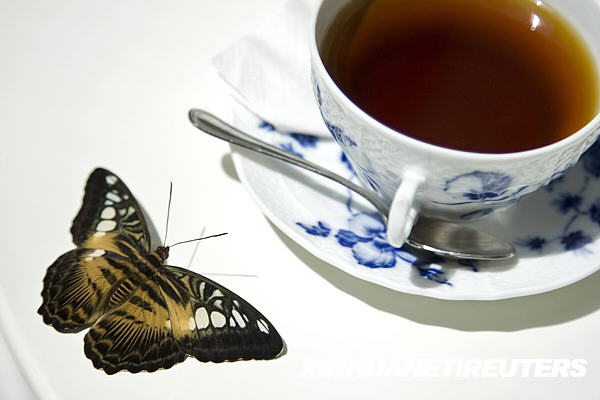 5月13日,在意大利首都羅馬博爾蓋塞博物館,一只蝴蝶落在一杯茶旁。新華社/路透