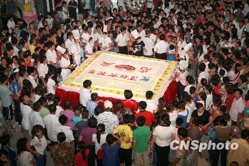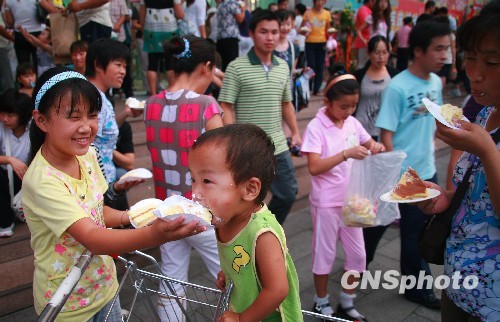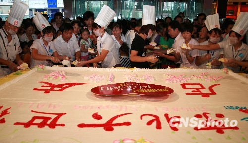 8月18日晚,某商場舉辦“千人體驗同吃和諧大蛋糕樂趣”店慶活動,3600多名北京市民一起體驗同吃大蛋糕樂趣,共祝祖國和諧昌盛。