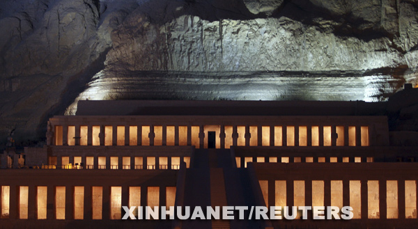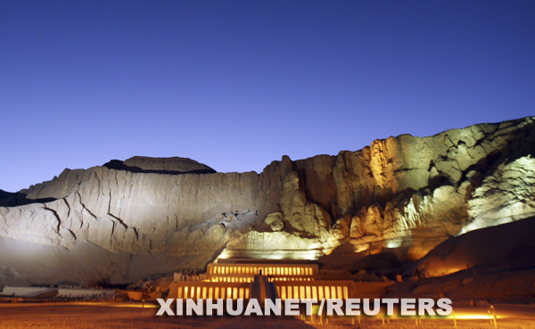 8月17日,在埃及中南部城市盧克索的西岸,新的照明設施照亮了夜幕下的哈特謝普蘇特神殿。