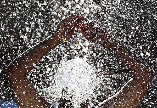在西班牙南部城市塞維利亞,一名男子在一個(gè)噴泉下沖水解暑。