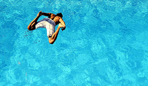 德國(guó)不萊梅,一名男子跳進(jìn)泳池避暑。