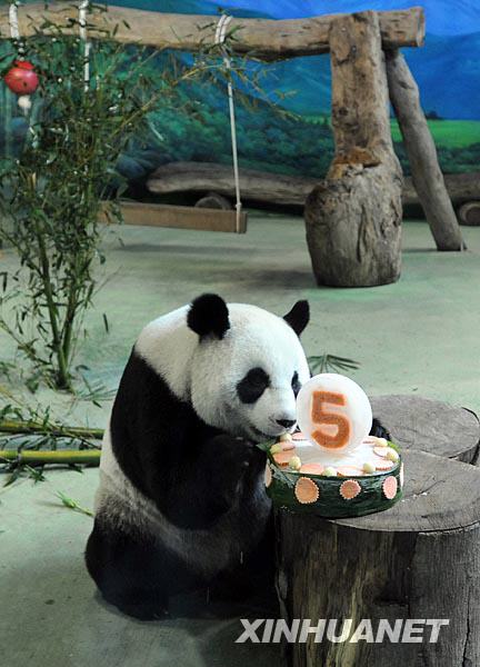 8月30日,“圓圓”(左)過生日,“團(tuán)團(tuán)”(右)也跟著沾光,一起分享蛋糕。