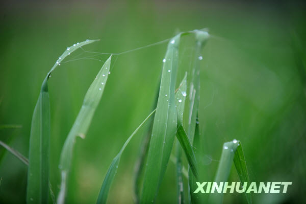 貴州省龍里縣一片稻田里的稻葉上掛著雨滴(9月13日攝)。 從9月12日晚起,貴州部分地區(qū)迎來(lái)一次降雨過(guò)程,給持續(xù)遭受?chē)?yán)重秋旱的農(nóng)作物送來(lái)及時(shí)雨。部分農(nóng)民已經(jīng)開(kāi)始收割本茬水稻,以便趁當(dāng)前有利墑情進(jìn)行后續(xù)秋種。