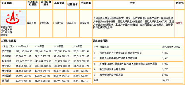 安徽安科生物工程(集團(tuán))股份有限公司主營重組人干擾素和重組人生長激素等生物藥品,擬發(fā)行2100萬股,募集資金16600萬元,發(fā)行后總股本不超過8400萬股。該公司今年上半年實(shí)現(xiàn)凈利潤2088.55萬元,每股收益0.33元。 安徽安科生物經(jīng)營范圍:自行研制、生產(chǎn)的生物制品、醫(yī)藥(基因重組制品、凝膠劑)及其原料、生化制品的出口和與公司生產(chǎn)、科研相關(guān)的原輔材料、機(jī)械設(shè)備、儀表儀器與零部件的進(jìn)口(特殊規(guī)定的除外);藥物、診斷試劑(體外診斷試劑)、生物技術(shù)和生化工程的原料及產(chǎn)品的研制、生產(chǎn)、銷售,技術(shù)轉(zhuǎn)讓、服務(wù)。
