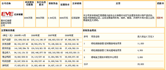 惠州億緯鋰能股份有限公司主營鋰亞電池、鋰錳電池、鋰離子和鋰聚合物電池、鎳氫電池等,擬發(fā)行2200萬股,募集資金20620萬元,發(fā)行后總股本不超過8800萬股。該公司今年上半年實現(xiàn)凈利潤1702.57萬元,每股收益0.26元。 公司主要服務(wù)于智能電網(wǎng)、射頻識別(RFID)、汽車電子(輪胎壓力監(jiān)測系統(tǒng)和安全防盜系統(tǒng))和安防產(chǎn)業(yè)(電子煙霧報警器)等領(lǐng)域,為上述領(lǐng)域提供高能量、長壽命、適用溫度范圍廣的新型環(huán)保鋰電池解決方案和產(chǎn)品。智能電表、智能識別卡、輪胎壓力監(jiān)測系統(tǒng)、安全防盜系統(tǒng)和電子煙霧報警器等均是近年來快速成長的產(chǎn)業(yè),這為公司的持續(xù)成長提供了廣闊的空間。