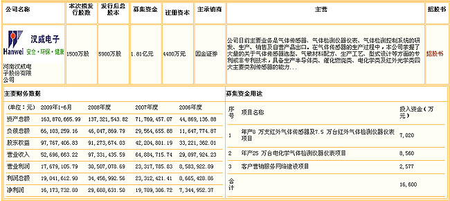 河南漢威電子股份有限公司主營氣體傳感器、氣體檢測儀器儀表和氣體檢測控制系統(tǒng),擬發(fā)行1500萬股,募集資金18157萬元,發(fā)行后總股本不超過5900萬股。該公司今年上半年實(shí)現(xiàn)凈利潤1617.37萬元,每股收益0.37元。 公司研究、開發(fā)、生產(chǎn)、銷售電子傳感器;電子監(jiān)控技術(shù)開發(fā);研究、開發(fā)、生產(chǎn)、銷售檢測儀器及控制系統(tǒng)、機(jī)械電器設(shè)備、防爆電氣系列產(chǎn)品;提供技術(shù)轉(zhuǎn)讓、技術(shù)服務(wù)、技術(shù)咨詢;計(jì)算機(jī)軟件開發(fā)與銷售;計(jì)算機(jī)網(wǎng)絡(luò)工程施工;防爆設(shè)備安裝工程施工(以上憑資質(zhì)證經(jīng)營);經(jīng)營本企業(yè)自產(chǎn)產(chǎn)品的出口業(yè)務(wù)和本企業(yè)所需的機(jī)械設(shè)備、零配件、原輔材料的進(jìn)口業(yè)務(wù),但國家限定公司經(jīng)營或禁止進(jìn)出口的商品除外。