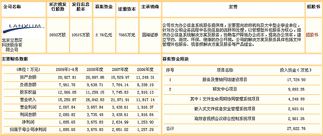 北京立思辰科技股份有限公司主營(yíng)文件管理外包服務(wù),注冊(cè)時(shí)間為1999年1月8日。公司董事長(zhǎng)池燕明90年代初就開始從事復(fù)印相關(guān)的服務(wù)和產(chǎn)品銷售。根據(jù)公開資金顯示,立思辰在2004年之前主要從事復(fù)印機(jī)的代理銷售。 但是由于行業(yè)競(jìng)爭(zhēng)激烈、利潤(rùn)率降低,2004年之后公司借鑒國(guó)外文件管理外包的模式,轉(zhuǎn)型做一家服務(wù)性企業(yè)。模式就是企業(yè)將打印服務(wù)業(yè)務(wù)交給專業(yè)的服務(wù)提供商,進(jìn)行"按需打印、按張收費(fèi)",企業(yè)無(wú)須購(gòu)買設(shè)備,而專業(yè)的服務(wù)商通過一系列技術(shù)手段,監(jiān)控所有的設(shè)備,提供全面的設(shè)備運(yùn)營(yíng)管理,幫助企業(yè)節(jié)省費(fèi)用以及提高效率。 招股說明書顯示,公司近年處于快速成長(zhǎng)階段。2006-2008年度營(yíng)業(yè)收入分別為11817萬(wàn)、21871萬(wàn)、26842萬(wàn),復(fù)合增長(zhǎng)率為50.72%;公司2006-2008年度凈利潤(rùn)分別為1253萬(wàn)、2694萬(wàn)、3675萬(wàn),復(fù)合增長(zhǎng)率為71.22%。 2009年上半年,公司銷售收入和利潤(rùn)分別為15250萬(wàn)和1885萬(wàn);不過招股說明書為提供08年同期的數(shù)據(jù)。 公司的辦公信息系統(tǒng)解決方案及服務(wù)客戶主要是于政府機(jī)構(gòu)和多個(gè)行業(yè)的大中型企事業(yè)單位。 招股說明書顯示,2009年上半年,公司前五大客戶為內(nèi)蒙庫(kù)勞動(dòng)和社會(huì)保障廳、國(guó)家統(tǒng)計(jì)與、民生銀行(6.65,-0.11,-1.63%)、中石油(13.18,-0.23,-1.72%)西氣東送管道分公司、北京匯成嘉和科技有限公司,五大客戶占銷售總額的29.48%。 2008年公司的市場(chǎng)占有率為6.1%,居第二的位置,第一位的富士施樂市場(chǎng)占有率為17.04%。