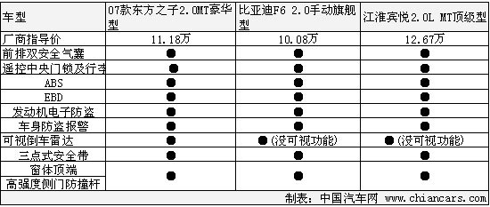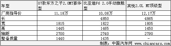 從上面的表中我們可以看出,賓悅的價格比F6整整多出了2萬多元,很明顯,沒有什么理由讓消費者去多掏那2萬元。從車身尺寸對比可以看處,賓悅是三者中擁有最長車身的車型,而身高和寬度上比亞迪更勝一籌。軸距上的優(yōu)勢使賓悅的內(nèi)部乘坐空間相對其他兩款車型會好點,穩(wěn)定性好了,轉(zhuǎn)向靈活性就會相應(yīng)的差點。質(zhì)量的多少賓悅雖然沒有公布出來,但是從各數(shù)據(jù)可以判斷出,賓悅的整備質(zhì)量應(yīng)該是三款車型中是最重的,無疑也是對油耗影響最大的。