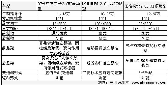 從表中對比我們看出,動力性能F6最強,最大功率103千瓦,最大扭矩186牛米。剩余兩款車最大功率完全一致,最大扭矩依次為東方之子182牛米,賓悅172牛米,均集中在4500轉(zhuǎn)為最大值。前后制動都是采用盤式,驅(qū)動形式也都采用了前驅(qū)驅(qū)動。
