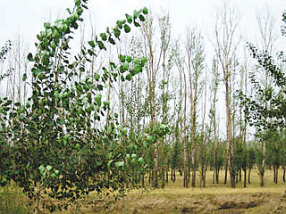 | 由于地下水位降低,通遼市開魯縣萬里大造林公司名下的部分成材楊樹林長勢不好。本報記者 賀勇