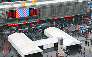 一月四日,上;疖囌敬哼\(yùn)候車帳篷正式啟用。新華社發(fā) | 1月2日、3日,記者先后前往北京站、北京西站采訪,發(fā)現(xiàn)農(nóng)民工返鄉(xiāng)客流已經(jīng)出現(xiàn)增長,普通售票窗口及特設(shè)的農(nóng)民工團(tuán)體票窗口前均排起了長隊(duì),一些熱門線路已經(jīng)“一票難求”。 根據(jù)鐵道部部署,2009年鐵路春運(yùn)將從1月11日開始,到2月19日結(jié)束,不過根據(jù)客流情況,全國各鐵路局幾乎都在元旦前后提前進(jìn)入春運(yùn)狀態(tài)。鐵道部預(yù)測2009年春運(yùn)全路將發(fā)送旅客1.88億人次,同比增長8%,鐵路運(yùn)輸能力仍然緊張。 春運(yùn)期間“一票難求”最主要原因是運(yùn)力不能滿足突然激增的客流。春運(yùn)期間,如何避開客流高峰期,確保既走得了又走得好呢?