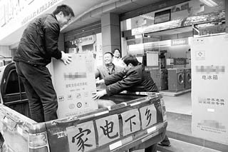 牛年大年初七,山東省平度市麻蘭鎮(zhèn)的4名村民結(jié)伴進(jìn)城,走入一家海爾家電專賣店。經(jīng)過一番比較,每人挑了1臺(tái)冰箱。4戶人家各有各的眼光,不過他們做出了相同的選擇——這些冰箱的醒目位置都貼著統(tǒng)一的“家電下鄉(xiāng)”紅色標(biāo)志。農(nóng)民購買這樣的家電,價(jià)格的13%由政府出,一臺(tái)價(jià)值2000元的冰箱,補(bǔ)貼就是