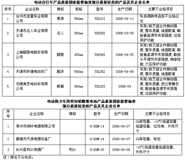 此次共抽查了天津、江蘇、浙江、上海、山東、廣東、四川等七個(gè)省、市部分企業(yè)生產(chǎn)的產(chǎn)品。抽查結(jié)果表明,大型企業(yè)的產(chǎn)品質(zhì)量繼續(xù)保持較高水平,產(chǎn)品抽樣合格率均超過(guò)90%,而小型企業(yè)的產(chǎn)品質(zhì)量問題較多,整車抽樣合格率為65.7%,車用蓄電池抽樣合格率僅為58%。