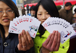 3月6日,兩名女青年在展示“外出務工婦女安全須知”宣傳撲克牌。當日,安徽省“三八”維權(quán)月活動正式啟動。安徽省婦聯(lián)將開展“春風送崗位”“送法律下鄉(xiāng)”等系列活動,重點對青年婦女和兒童進行維權(quán)宣傳。