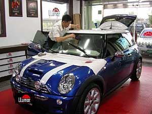 專家建議為汽車安裝貼膜最好到專業(yè)店。 圖為在北京一家“龍膜”授權(quán)施工連鎖店,“龍膜”技師正在為汽車安裝前擋膜。Lois