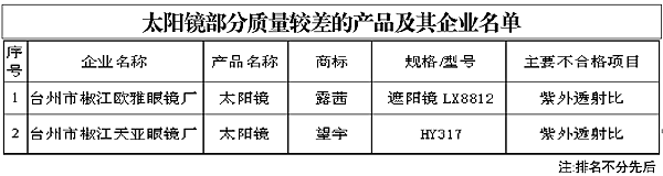 日前,國家質(zhì)檢總局組織對太陽鏡產(chǎn)品質(zhì)量進行了國家監(jiān)督抽查,共抽查了北京、河北、山西、上海、江蘇、浙江、安徽、陜西等八個省、直轄市71家企業(yè)生產(chǎn)的90種產(chǎn)品(不涉及出口產(chǎn)品),產(chǎn)品實物質(zhì)量合格率為86.7%。 此次抽查中發(fā)現(xiàn)的主要質(zhì)量問題有,第一,個別產(chǎn)品紫外透射比不合格。強制性國家標(biāo)準(zhǔn)規(guī)定,太陽鏡產(chǎn)品的紫外透射比應(yīng)小于5%。抽查中有個別產(chǎn)品紫外透射比不合格。配戴這種眼鏡在遮擋部分可見光的同時,沒有阻隔紫外線,比不戴眼鏡所接受的紫外光還要多,眼睛接受太多紫外線,容易引發(fā)眼疾。 第二,個別產(chǎn)品標(biāo)簽標(biāo)注不規(guī)范。太陽鏡按用途可分為遮陽鏡、淺色太陽鏡和特殊用途太陽鏡三類,強制性行業(yè)標(biāo)準(zhǔn)規(guī)定,太陽鏡應(yīng)注明類別。抽查中有個別產(chǎn)品是未注明太陽鏡類別,未標(biāo)注工業(yè)產(chǎn)品生產(chǎn)許可證標(biāo)志和編號。