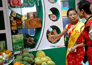 | 10月28日,第四屆中國-東盟博覽會上,中國廣西農(nóng)墾集團工作人員向客人介紹中國綠色農(nóng)產(chǎn)品。新華社發(fā)(楊紹功