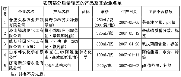 為維護(hù)廣大農(nóng)民消費者的合法權(quán)益,促進(jìn)農(nóng)藥行業(yè)健康發(fā)展,國家質(zhì)檢總局組織對農(nóng)藥產(chǎn)品質(zhì)量進(jìn)行了國家監(jiān)督抽查。共抽查了江蘇、浙江、安徽、山東等四個省65家企業(yè)生產(chǎn)的80種產(chǎn)品(不涉及出口產(chǎn)品),產(chǎn)品實物質(zhì)量合格率為90%。 此次抽查依據(jù)GB9552-1999《百菌清可濕性粉劑》等強(qiáng)制性國家標(biāo)準(zhǔn)及相關(guān)產(chǎn)品標(biāo)準(zhǔn)規(guī)定的要求,對農(nóng)藥產(chǎn)品的有效成分含量、懸浮率、乳液穩(wěn)定性、稀釋穩(wěn)定性、細(xì)度、水分、pH值以及標(biāo)簽等八個項目進(jìn)行了檢驗。 抽查中發(fā)現(xiàn)的主要質(zhì)量問題:個別產(chǎn)品有效成分不符合標(biāo)準(zhǔn)要求。其中有一種產(chǎn)品有效成分氰戊菊酯含量應(yīng)為5.0%,實測氰戊菊酯含量為零;有一種產(chǎn)品有效成分辛硫磷含量應(yīng)為15.0%,實測結(jié)果不含辛硫磷成分。使用有效成分含量不足的農(nóng)藥,起不到預(yù)期的防治效果,直接影響農(nóng)作物的生長;個別產(chǎn)品pH值不合格、水分含量超標(biāo)。其中有一種產(chǎn)品標(biāo)準(zhǔn)規(guī)定pH值范圍為4.0至7.0,實測pH值為1.5;有一種產(chǎn)品水分含量標(biāo)準(zhǔn)規(guī)定≤0.5%,實測水分含量為4.3%。pH值、水分含量不合格會導(dǎo)致農(nóng)藥產(chǎn)品質(zhì)量不穩(wěn)定,達(dá)不到產(chǎn)品的預(yù)期藥效;部分產(chǎn)品標(biāo)簽標(biāo)注不規(guī)范。抽查中有部分產(chǎn)品未標(biāo)明有效成分含量、許可證產(chǎn)品未按規(guī)定標(biāo)注QS標(biāo)志等。