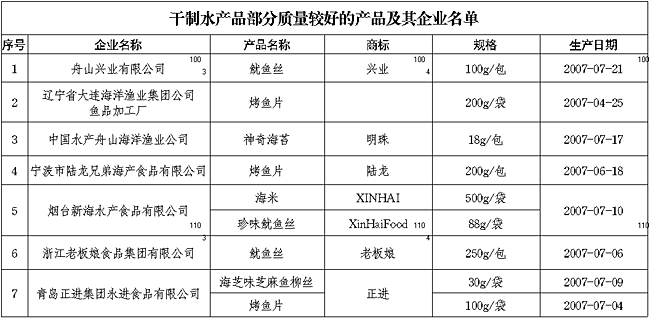國家質(zhì)檢總局日前對(duì)水產(chǎn)品行業(yè)進(jìn)行抽查,共查了河北、天津、遼寧、上海、浙江、福建、山東等七個(gè)省、直轄市58家企業(yè)生產(chǎn)的65種產(chǎn)品(不涉及出口產(chǎn)品),產(chǎn)品實(shí)物質(zhì)量合格率為95.4%。 此次抽查的干制水產(chǎn)品主要有烤魚片、魷魚絲、風(fēng)味魚干、紫菜、蝦皮、蝦米、干貝、魷魚干等。依據(jù)GB10144-2005《動(dòng)物性水產(chǎn)干制品衛(wèi)生標(biāo)準(zhǔn)》等強(qiáng)制性國家標(biāo)準(zhǔn)及相關(guān)產(chǎn)品標(biāo)準(zhǔn)規(guī)定的要求,對(duì)干制水產(chǎn)品的感官、無機(jī)砷、鉛、甲基汞、酸價(jià)、過氧化值、亞硫酸鹽、苯甲酸、山梨酸、多氯聯(lián)苯、菌落總數(shù)、大腸菌群、霉菌、沙門氏菌、金黃色葡萄球菌、副溶血性弧菌、志賀氏菌以及食品標(biāo)簽等18個(gè)項(xiàng)目進(jìn)行了檢驗(yàn)。 抽查結(jié)果表明,一是連續(xù)多年的國家監(jiān)督抽查促進(jìn)了企業(yè)質(zhì)量意識(shí)的提高,產(chǎn)品質(zhì)量保持穩(wěn)定;二是市場占有率較高的大型企業(yè)的產(chǎn)品實(shí)物質(zhì)量合格率為100%。 抽查中發(fā)現(xiàn)的主要質(zhì)量問題: