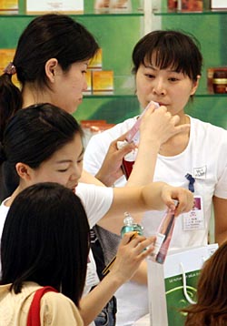 本報(bào)資料照片 | 近期,一直以高價(jià)姿態(tài)“屹立”在中國(guó)市場(chǎng)上的高檔進(jìn)口化妝品品牌的銷售策略似乎開(kāi)始動(dòng)搖,與此同時(shí),由國(guó)外品牌力推的無(wú)添加、精油等新概念正在化妝品市場(chǎng)掀起熱潮。專家表示,雖然國(guó)內(nèi)消費(fèi)者在化妝品方面的支出越來(lái)越大,但是不少消費(fèi)者在化妝品方面還存在誤區(qū):一方面,國(guó)內(nèi)消費(fèi)者一味青睞國(guó)外品牌,使化妝品市場(chǎng)出現(xiàn)幾乎被國(guó)外品牌全盤(pán)壟斷的局面;另一方面,消費(fèi)者大多只看化妝品的短期功效,不注重從內(nèi)而外的護(hù)理。