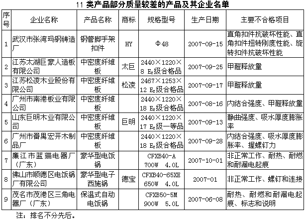 國(guó)家質(zhì)檢總局近日組織對(duì)預(yù)應(yīng)力混凝土用鋼絞線、鋼管腳手架扣件、電線電纜、中密度纖維板、家用燃?xì)庠、室?nèi)加熱器、電磁爐、自動(dòng)電飯鍋、電熱水壺、汽車(chē)用制動(dòng)器襯片、塑料外殼式斷路器等11類(lèi)產(chǎn)品質(zhì)量進(jìn)行了國(guó)家監(jiān)督專(zhuān)項(xiàng)抽查,共抽查了460家企業(yè)生產(chǎn)的475種產(chǎn)品(不涉及出口產(chǎn)品),產(chǎn)品實(shí)物質(zhì)量抽樣合格率為96.5%。 此次抽查主要對(duì)電器產(chǎn)品的安全項(xiàng)目以及產(chǎn)品的主要性能指標(biāo)、中密度纖維板的甲醛釋放量等項(xiàng)目進(jìn)行了檢驗(yàn)。經(jīng)檢驗(yàn),11類(lèi)產(chǎn)品實(shí)物質(zhì)量抽樣合格率平均比上次提高了12.6個(gè)百分點(diǎn)。有36種獲國(guó)家免檢產(chǎn)品和10種中國(guó)名牌產(chǎn)品,產(chǎn)品實(shí)物質(zhì)量抽樣合格率為100%。 預(yù)應(yīng)力混凝土用鋼絞線產(chǎn)品的被抽查企業(yè)均獲得了生產(chǎn)許可證,產(chǎn)量約占全國(guó)總產(chǎn)量的80%。在近三次的國(guó)家監(jiān)督抽查中實(shí)物質(zhì)量抽樣合格率均為100%。 鋼管腳手架扣件產(chǎn)品實(shí)物質(zhì)量抽樣合格率為97.2%,與上次相比抽樣合格率提高了27.2個(gè)百分點(diǎn)。抽查中存在的質(zhì)量問(wèn)題,主要是材質(zhì)未達(dá)到可鍛鑄鐵KTH330-08牌號(hào)的要求;產(chǎn)品力學(xué)性能未達(dá)到標(biāo)準(zhǔn)規(guī)定要求等。 電線電纜產(chǎn)品俗稱(chēng)塑料電線,此次產(chǎn)品實(shí)物質(zhì)量抽樣合格率為98.3%。 中密度纖維板產(chǎn)品實(shí)物質(zhì)量抽樣合格率為87.3%,大型生產(chǎn)企業(yè)產(chǎn)品實(shí)物質(zhì)量抽樣合格率為100%。經(jīng)檢驗(yàn),中密度纖維板產(chǎn)品的含水率和密度偏差兩項(xiàng)指標(biāo)在連續(xù)三次的國(guó)家監(jiān)督抽查中,單項(xiàng)符合率均為100%,靜曲強(qiáng)度、彈性模量等指標(biāo)單項(xiàng)符合率穩(wěn)步提高。但抽查中也存在一些質(zhì)量問(wèn)題,主要是甲醛釋放量、吸水厚度膨脹率、內(nèi)結(jié)合強(qiáng)度項(xiàng)目不合格。 家用燃?xì)庠町a(chǎn)品從2000年以來(lái)已連續(xù)抽查了七次,此次產(chǎn)品實(shí)物質(zhì)量抽樣合格率為96.8%,與上次相比抽樣合格率提高了21.8個(gè)百分點(diǎn),檢驗(yàn)的安全指標(biāo)項(xiàng)目中有九項(xiàng)重要指標(biāo)單項(xiàng)符合率達(dá)到了100%。 室內(nèi)加熱器產(chǎn)品質(zhì)量逐年提高,此次產(chǎn)品實(shí)物質(zhì)量抽樣合格率為99.9%,與上次相比抽樣合格率提高了14.9個(gè)百分點(diǎn)。歷次抽查質(zhì)量問(wèn)題較多的對(duì)觸及帶電部件的防護(hù)、工作溫度下泄漏電流和電氣強(qiáng)度、結(jié)構(gòu)、外部導(dǎo)線用接線端子等安全項(xiàng)目在此次專(zhuān)項(xiàng)抽查中單項(xiàng)符合率均達(dá)到100%。 電磁灶產(chǎn)品實(shí)物質(zhì)量抽樣合格率為98.9%。有五種獲國(guó)家免檢產(chǎn)品整體質(zhì)量較好,產(chǎn)品實(shí)物質(zhì)量抽樣合格率為100%。檢驗(yàn)的安全項(xiàng)目中有九項(xiàng)重要指標(biāo)單項(xiàng)符合率達(dá)到了100%,其中輸入功率和電流、防水、絕緣電阻和電氣強(qiáng)度、接地措施、爬電距離、電氣間隙和穿通絕緣距離等指標(biāo)在連續(xù)四次的國(guó)家監(jiān)督抽查中全部達(dá)到國(guó)家強(qiáng)制性標(biāo)準(zhǔn)規(guī)定的要求。 自動(dòng)電飯鍋產(chǎn)品實(shí)物質(zhì)量抽樣合格率為90.3%。抽查中發(fā)現(xiàn)的質(zhì)量問(wèn)題,主要是非正常工作、耐熱、耐燃和耐漏電起痕項(xiàng)目不合格。 電熱水壺產(chǎn)品經(jīng)歷了幾年的更新?lián)Q代,現(xiàn)在的主流產(chǎn)品是具有溫控、防干燒、超溫保護(hù)等功能的無(wú)繩式結(jié)構(gòu)的電熱水壺產(chǎn)品,從結(jié)構(gòu)設(shè)計(jì)上有效地保護(hù)了產(chǎn)品的質(zhì)量安全。此次抽查產(chǎn)品實(shí)物質(zhì)量抽樣合格率為99.2%,與上次相比抽樣合格率提高了25.9個(gè)百分點(diǎn)。 汽車(chē)用制動(dòng)器襯片產(chǎn)品實(shí)物質(zhì)量合格率為98.9%。此次抽查汽車(chē)用制動(dòng)器襯片產(chǎn)品中的磨損率、指定摩擦系數(shù)允許偏差項(xiàng)目有較大提高,磨損率項(xiàng)目單項(xiàng)符合率達(dá)100%。 塑料外殼式斷路器產(chǎn)品實(shí)物質(zhì)量抽樣合格率為99.1%,與上次相比抽樣合格率提高了29.4個(gè)百分點(diǎn)。此次抽查中,塑料外殼式斷路器的額定極限短路分?jǐn)嗄芰?xiàng)目從2006年58.3%的單項(xiàng)符合率提高到此次的92.5%,提高了34.2個(gè)百分點(diǎn)。抽查結(jié)果表明,生產(chǎn)企業(yè)在技術(shù)能力和質(zhì)量控制方面有了明顯提高,在抽查檢驗(yàn)過(guò)程中外殼破碎、觸頭粘連等現(xiàn)象明顯減少。