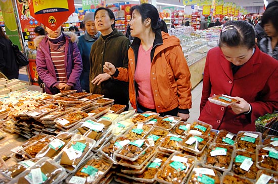 3月9日,市民正在銀川新華百貨連鎖超市豆制品柜臺選購封裝豆制品。