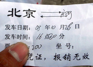 10月20日下午14時(shí),記者來到北京西站北一出口的地下出站廣場,這里有一個(gè)免費(fèi)問詢臺(tái),上方懸掛了幾個(gè)電子顯示屏,顯示著從北京出發(fā)的長途客車線路。 此前記者了解到,每天都有大量的乘客被如此“安排”到長途客車上。而據(jù)記者觀察,不到一個(gè)小時(shí),就有33名乘客從這里被安排到了長途客車上。 問詢臺(tái)內(nèi)坐著幾個(gè)身著便服的“工作人員”,有乘客詢問事項(xiàng)時(shí),他們也會(huì)給予解答,但當(dāng)有人問長途車的問題時(shí),他們會(huì)馬上回應(yīng):“我們是八王墳長途客運(yùn)站設(shè)在這里的售票網(wǎng)點(diǎn),考慮到北京西站往東北方向去的車次很少,為了減少乘客從北京西站趕到八王墳的麻煩,我們?cè)谶@里有專車接送,能直接把乘客送到開往東北的長途大客車上! 據(jù)“工作人員”介紹,16時(shí)會(huì)有一班長途車發(fā)往沈陽,票價(jià)是160元。記者交錢后,得到一張名片大小的紙片,上面印著“北京到沈陽”字樣和票價(jià)等信息,紙片的背面則印著“由于時(shí)間關(guān)系,代售點(diǎn)無法出電腦票,臨時(shí)用此憑證,到長途車站后換票,請(qǐng)各位旅客諒解”。 隨后,一名“工作人員”把記者帶到一塊空地上候車,在這里已經(jīng)有10多名乘客。這個(gè)“候車區(qū)”有專人維持秩序,每隔20多分鐘就會(huì)有一名年輕男子從問詢臺(tái)里走出,大喊“去XX地的乘客跟我走!”隨后帶領(lǐng)乘客向北京西站東停車場走去。 15時(shí)45分,那名年輕人再次走出問詢臺(tái)高喊:“去沈陽的跟我走了!”連同記者在內(nèi)的8名乘客被帶進(jìn)停車場,乘坐一輛面包車離開。記者與面包車司機(jī)聊天得知,北京西站有多輛面包車負(fù)責(zé)拉送乘客到京沈高速公路輔路。 16時(shí)10分,面包車來到了位于北京市朝陽區(qū)方家村附近的京沈高速公路輔路上,兩輛懸掛著“北京-沈陽”牌子的大客車正停在路邊候客。 包括記者在內(nèi)的8名乘客被安排在其中一輛大客車上,在確認(rèn)完人數(shù)后,大客車的售票員交給面包車司機(jī)160元。又等到幾批乘客后,17時(shí)20分,大客車才駛?cè)刖┥蚋咚僦髀贰?BR> 最后,在記者的強(qiáng)烈要求下,售票員才拿出一張既沒有始發(fā)站標(biāo)注、也不能作為報(bào)銷憑證的代客票。