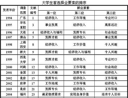 為了能夠比較準(zhǔn)確回答上述問題,揭示當(dāng)代大學(xué)生的擇業(yè)觀,我們采用文獻分析的方法,在中國期刊全文數(shù)據(jù)庫中以大學(xué)生擇業(yè)觀調(diào)查為主題搜尋1980年至今公開發(fā)表的有關(guān)大學(xué)生擇業(yè)觀的調(diào)查報告,查得69篇文獻。通過進一步調(diào)查篩選,查找具有同質(zhì)性、可比較性的文獻,最終確定24篇作為研究樣本。在文獻搜尋中發(fā)現(xiàn),上世紀(jì)80年代初到90年代初的這方面調(diào)查報告很少。1994年之后這方面的調(diào)查多了起來,所以選取的報告主要從1994年開始。這24篇文獻調(diào)查的地域廣泛,涉及京、滬、粵、浙、豫、皖等地;學(xué)科齊全,設(shè)計文、理、農(nóng)、醫(yī)、工等學(xué)科;樣本數(shù)量大,發(fā)放問卷的數(shù)量近5萬,回收率平均在85%以上,調(diào)查結(jié)果具有比較好的可信度和代表性。 這些調(diào)查報告向我們揭示了大學(xué)生擇業(yè)的基本傾向,以下是對各報告主要調(diào)查結(jié)果的匯總: 從以上表格中我們可以看出,上世紀(jì)90年代以來大學(xué)生的擇業(yè)觀念相對穩(wěn)定,比較一致,大學(xué)生所在地域、學(xué)校、所學(xué)專業(yè)及性別等對大學(xué)生擇業(yè)觀的影響并不顯著。大學(xué)生們選擇職業(yè)時優(yōu)先考慮的因素主要有兩大類,物質(zhì)因素首當(dāng)其沖,如經(jīng)濟收入、物質(zhì)待遇、工資福利、報酬、工作環(huán)境,甚至離家的遠近等;第二類因素為個人職業(yè)發(fā)展因素,如個人興趣、專長的發(fā)揮、自我價值的實現(xiàn)、工作發(fā)展前景、單位前景、晉升機會、發(fā)展機會、社會地位等。