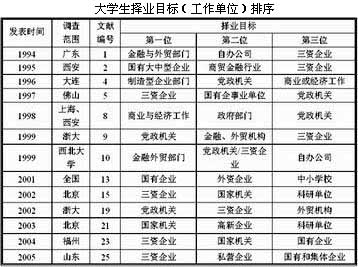 擇業(yè)觀是職業(yè)價值觀的重要組成部分,對大學(xué)生的擇業(yè)行為有著重要的影響。從1985年中央頒布的《關(guān)于教育體制改革的決定》為標(biāo)志,我國大學(xué)生的就業(yè)制度從計劃經(jīng)濟的統(tǒng)包統(tǒng)配開始轉(zhuǎn)向市場經(jīng)濟的自主擇業(yè)、雙向選擇,至今已走過了20年的歷程。在大學(xué)生就業(yè)壓力有增無減的今天,很多人認(rèn)為大學(xué)生的擇業(yè)觀也是造成其就業(yè)難的原因之一。那么,大學(xué)生的擇業(yè)觀具有什么樣的特點?在長達20年的歷史發(fā)展階段,不同年代大學(xué)生的擇業(yè)觀有沒有明顯的變化?如果說大學(xué)生的擇業(yè)觀有偏差的話,又該怎樣調(diào)整這種偏差?
