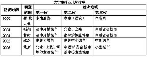 不僅北京地區(qū)的大學(xué)生如此,1999年一項針對西部地區(qū)大學(xué)生的調(diào)查數(shù)據(jù)顯示,地域上選擇上排在第一位的是東南沿海占57.5%,幾乎沒有人愿意留在西部;