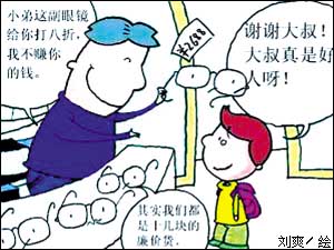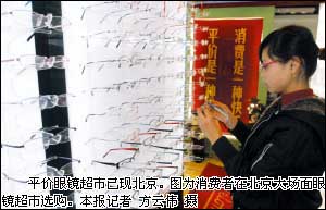 。玻霸溺R架,200元賣(mài)給你是講人情,300元賣(mài)給你是講交情,400元賣(mài)給你是行情!坨R業(yè)暴利順口溜。 一副眼鏡加價(jià)到底有多大?周樂(lè)正告訴記者,在目前的眼鏡經(jīng)營(yíng)模式中,從眼鏡出廠到消費(fèi)者終端,一副出廠價(jià)為22元的眼鏡通過(guò)傳統(tǒng)的經(jīng)銷(xiāo)渠道后,到消費(fèi)者手里價(jià)格最高可達(dá)430元。 現(xiàn)任北京好宜買(mǎi)超視眼鏡連鎖有限公司總經(jīng)理的周樂(lè)正近日接受本報(bào)記者采訪,自曝眼鏡業(yè)潛規(guī)則。記者見(jiàn)到他時(shí),他手腕上的刀痕還清晰可見(jiàn)。一年前,周樂(lè)正因創(chuàng)建平價(jià)眼鏡超市引進(jìn)低價(jià)競(jìng)爭(zhēng)而引來(lái)殺身之禍,被砍傷15刀。周樂(lè)正告訴記者,他家三代做眼鏡生意,目前他們家族在全國(guó)經(jīng)營(yíng)著30多家眼鏡店。 一副眼鏡加價(jià)到底有多少?周樂(lè)正告訴記者,在目前的眼鏡經(jīng)營(yíng)模式中,一副出廠價(jià)為22元的眼鏡通過(guò)傳統(tǒng)的經(jīng)銷(xiāo)渠道后,到消費(fèi)者手里價(jià)格最高可達(dá)430元。
