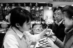 1月30日,北京工美大廈玉石商場的一位營業(yè)員向購買玉器的顧客介紹玉石。方云偉