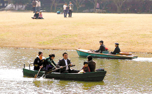 春天來(lái)了,游客在松江方塔公園內(nèi)蕩起小舟。沈家善 攝
