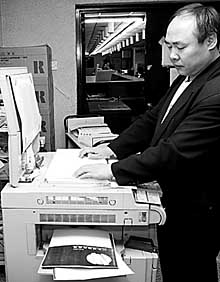 4月15日,國(guó)家圖書館第一復(fù)制室工作人員在為讀者復(fù)印圖書資料。自3月下旬以來(lái),國(guó)家圖書館全面調(diào)整復(fù)印費(fèi),其中,A4紙由每張0.5元下調(diào)到0.3元,B4紙由每張0.6元下調(diào)到0.4元。本報(bào)記者